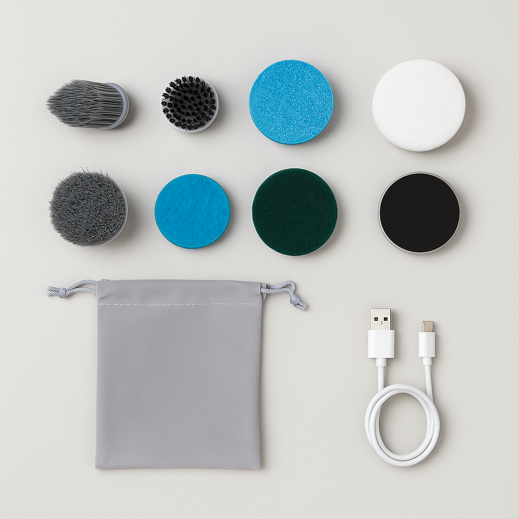 - Innehåller 8 borsthuvuden, 2 förlängningsstänger, en förvaringspåse och Type-C-laddare.